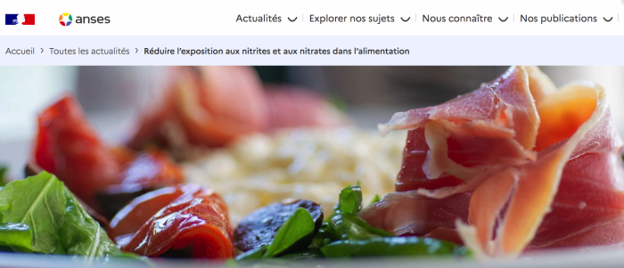ANSES官网头条新闻说:“我们的饮食每天都会让我们接触到亚硝酸盐和硝酸盐。鉴于目前对它们对人类健康影响的了解,ANSES 建议通过限制通过食物接触这些物质的积极措施来减少人们对这些物质的接触。为此,ANSES 确定了几个杠杆,特别是减少加工肉类中亚硝酸盐添加剂的使用,这必须以可控的方式进行,以避免食物中毒的增加。”